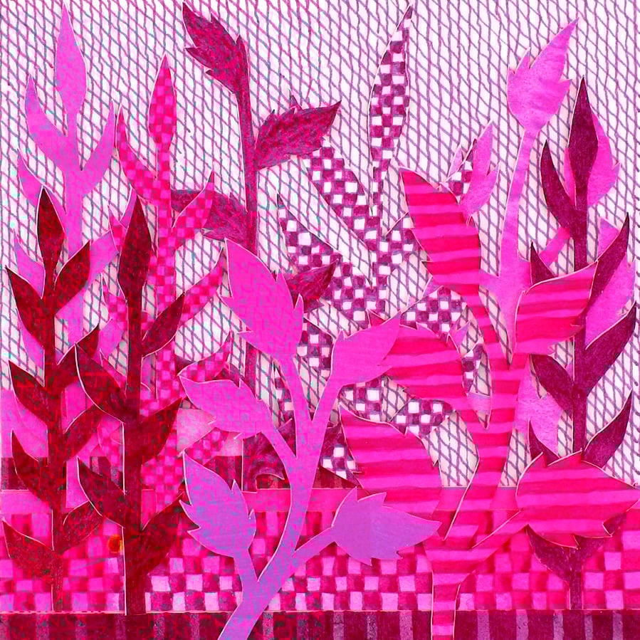 This framed mixed media collage consists of cut paper elements (collage), gouache painting, and pen drawing on paper. All patterns are hand-drawn, and the work's full size is about 3" x 3." Its framed size is about 9" x 9."