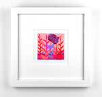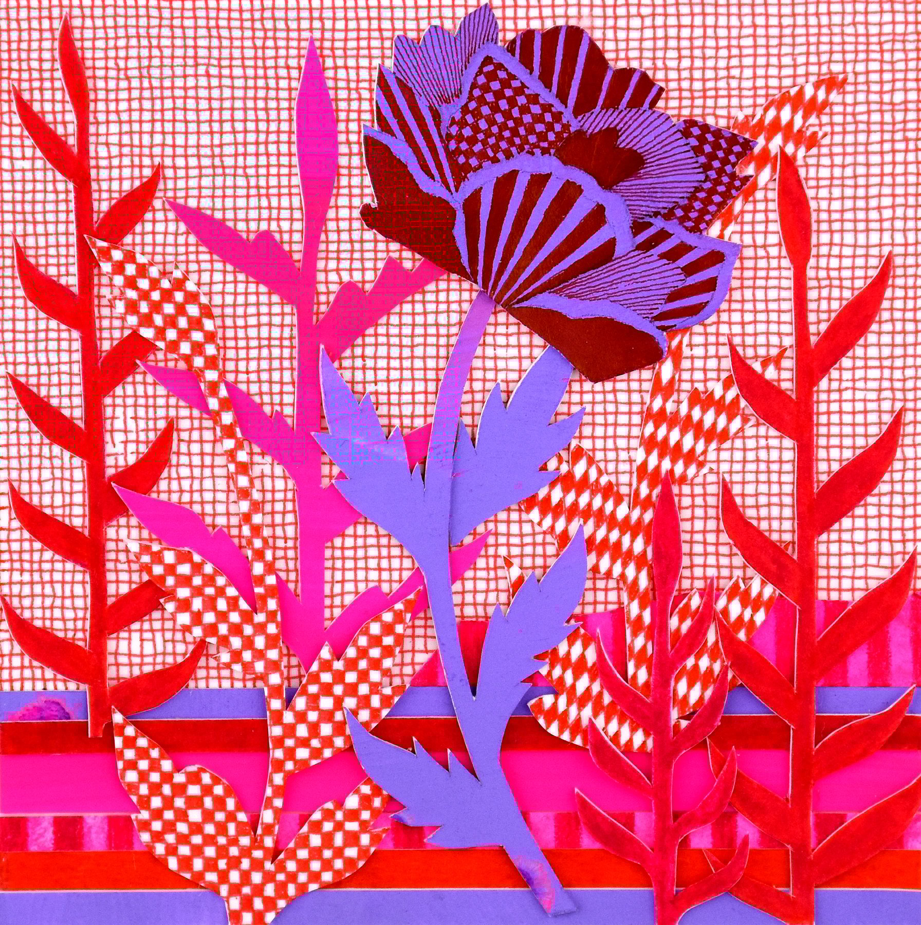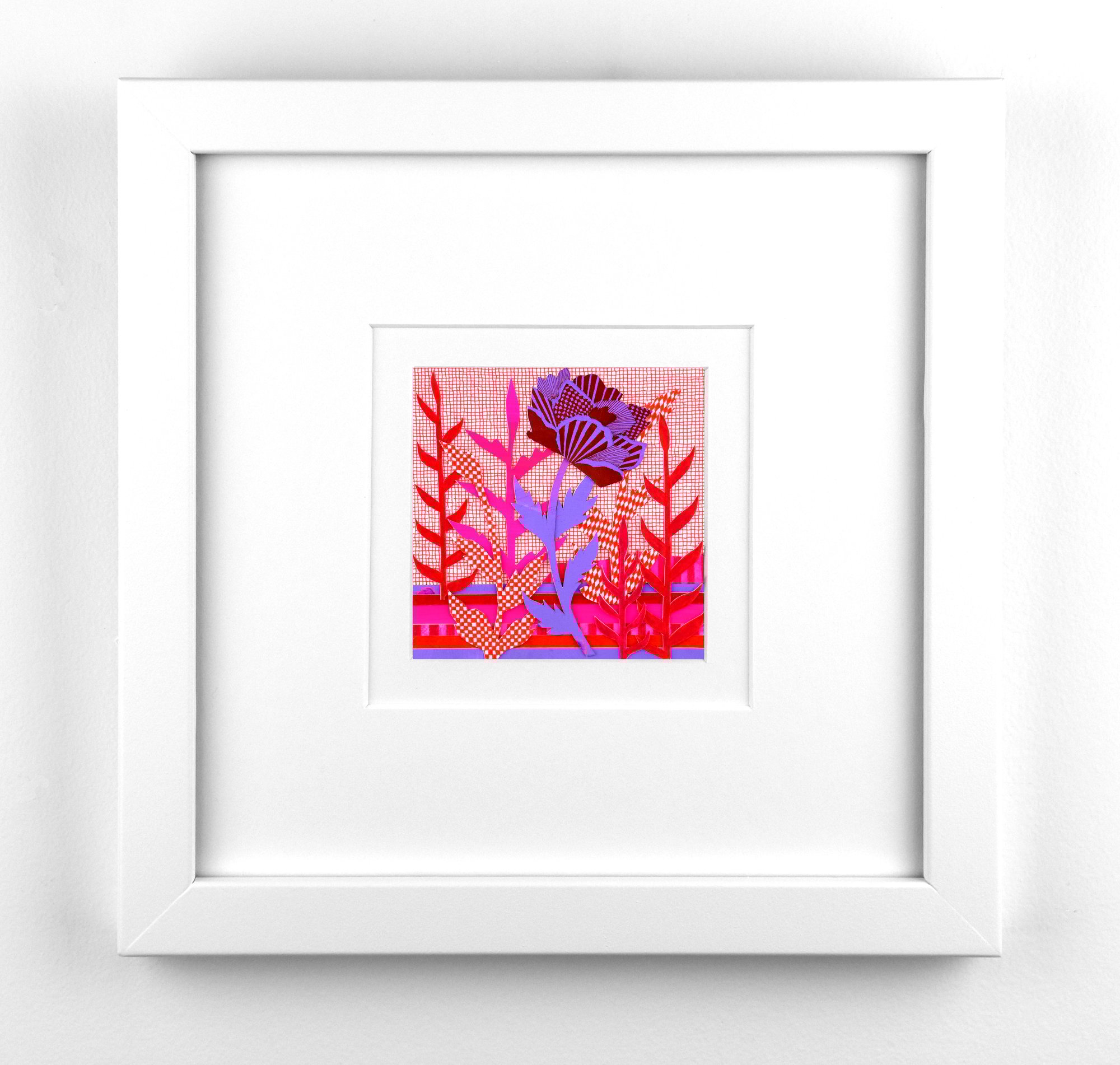 This framed mixed media collage consists of cut paper elements (collage), gouache painting, and pen drawing on paper. All patterns are hand-drawn, and the work's full size is about 3" x 3." Its framed size is about 9" x 9."